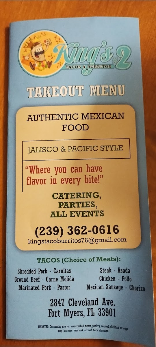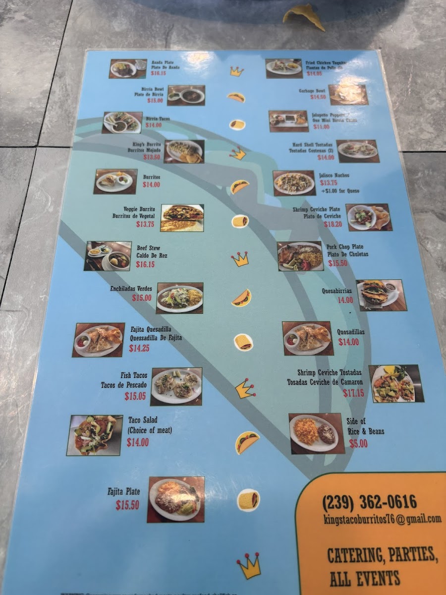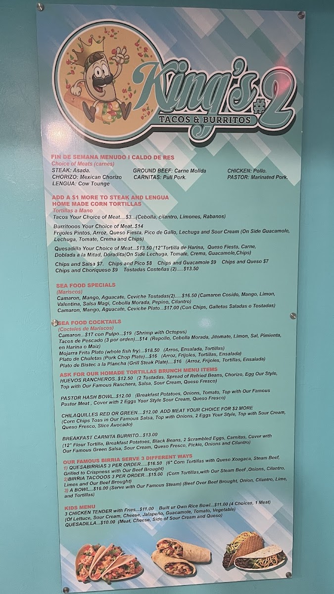 If you're craving authentic, flavorful Mexican cuisine, King's Tacos And Burritos 2 Menu is the place to satisfy your hunger. Located at 2847 Cleveland Ave, Fort Myers, this local favorite serves up a delicious variety of tacos, burritos, and other classic Mexican dishes, all made with the freshest ingredients. Whether you're in the mood for something spicy or prefer a milder flavor, there’s something for everyone. The menu boasts an impressive selection of fillings, from grilled meats to vegetarian options, allowing you to customize your meal just the way you like. Don’t forget to pair your taco or burrito with one of their tasty sides or a refreshing drink for the perfect meal experience. From casual lunches to late-night cravings, this spot is sure to become a go-to for anyone who loves bold, satisfying flavors.