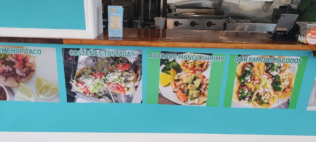 cold cooked shrimp, mango, avocado ceviche served on tostada (order comes with two) spread with light mayo. Comes with Valentina hot sauce and lime on side
